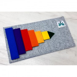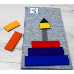 Tablica manipulacyjna „Wieża” służy do usprawniania i ćwiczeń motoryki małej. Podłużne klocki układamy na dołączonej planszy tak żeby powstała kolorowa wieża. Całość wykonana jest z bardzo dobrej jakości różnokolorowego filcu.